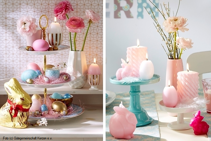Ein echter Blickfang und im Handumdrehen kreiert ist die charmante Osterdekoration auf der der Etagere. Zum Dekogras in Rosé passen pastell- und goldfarbene Oster-Accessoires und dekorative Eier-Kerzen. Kleine hasenförmige Kerzen, kombiniert mit Eier- und „gedrehten“ Stumpen-Kerzen in setzen leuchtende Akzente auf jeder Ostertafel.