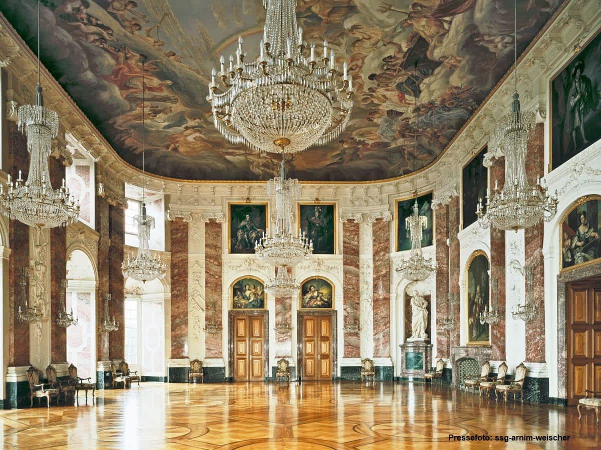 Im Inneren könnt ihr die wiederhergestellten Prunkräume besichtigen, darunter den imposanten Rittersaal und den eindrucksvollen Thronsaal. Tipp: Wenn ihr euch schon vorab einen Eindruck verschaffen wollt oder die Prunkräume nach eurem Besuch noch einmal in Ruhe erkunden möchtet, könnt ihr das Schloss sogar virtuell und kostenlos erleben -> Infos und den Download zur Tour