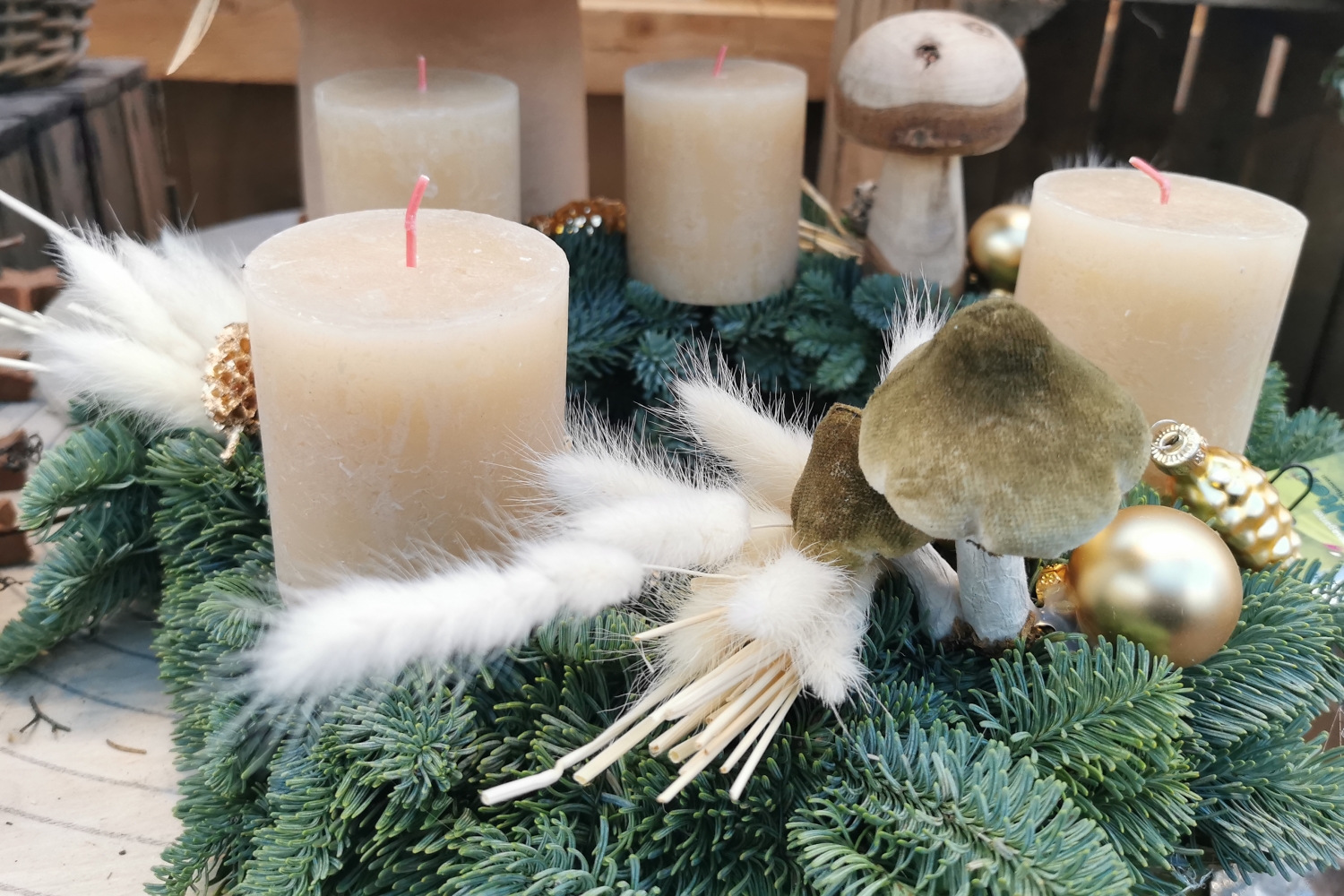 Helle Stumpenkerzen und natürliche Materialien zaubern stimmungsvolle Adventsdekorationen