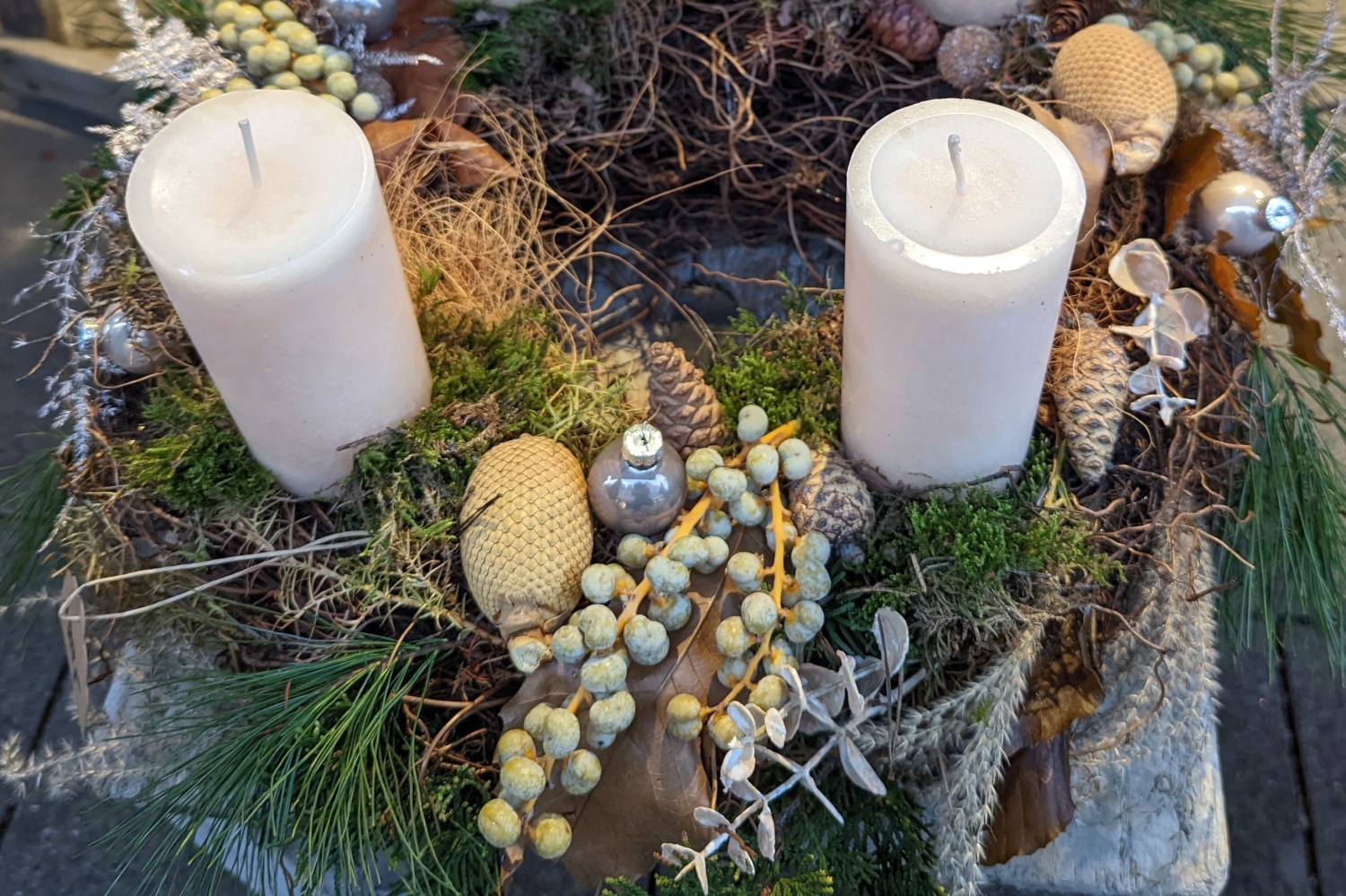 Auch ganz ohne Pflanzen lässt sich ein "Adventsgesteck" gestalten.