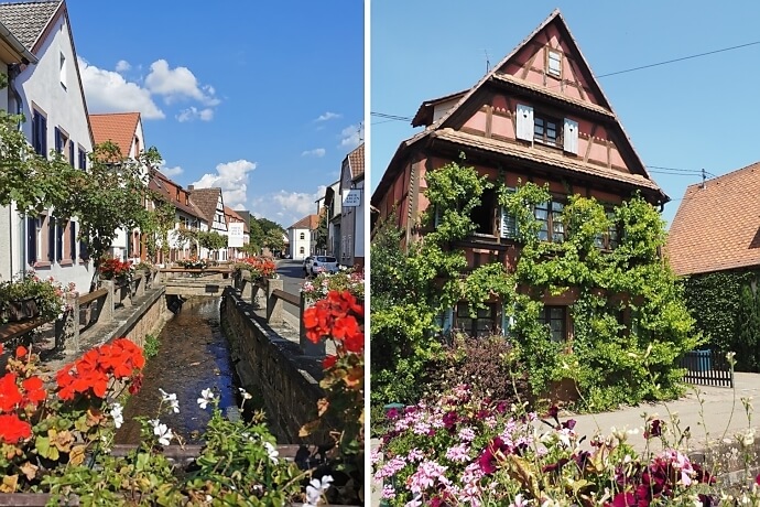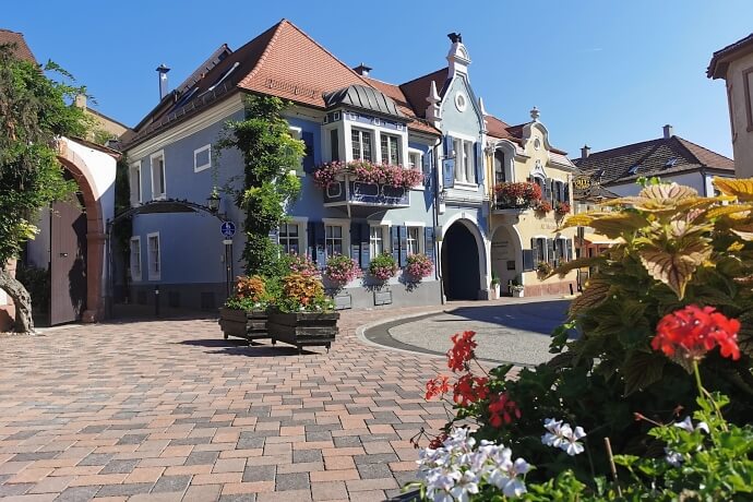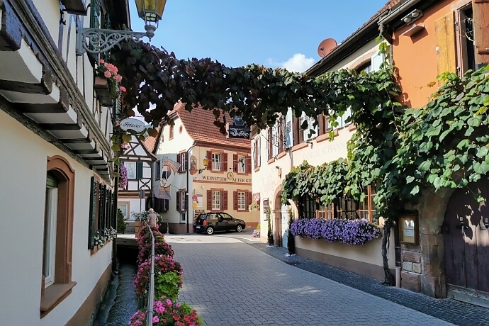 Die Weindörfer an der Weinstraße sind wunderschön. Richtige Bilderbuchorte. An Häuser, Mauern und Tore ranken Wilder Wein, Efeu, Clematis und Rosen, über die Straßen wölben sich grüne Reben und die Fensterbänke bestechen mit üppigem Blumenschmuck. Wir kommen aus dem Schwärmen gar nicht heraus. Die meisten Orte sind klein und man hat sie zu Fuß schnell erkundet, aber alles ist so idyllisch, dass wir ewig bleiben könnten.