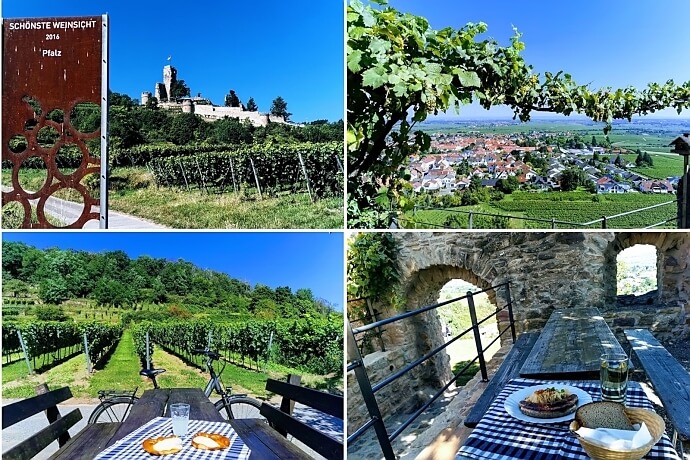 Die Pfalz ist auch bekannt für ihre zahlreiche Burgen. Zwar sind oft nur Ruinen übriggeblieben, aber die alten Gemäuer sind wegen ihres mittelalterlichen Charmes und der meist schönen Lage ein Besuch wert. Auch wir wollen uns eine Burg anschauen und den Ausflug mit einer Radtour durch die Weinberge verbinden. Wegen der Steigungen, die nicht zu unterschätzen sind, mieten wir uns E-Bikes und (fast) wie von Geisterhand geschoben radeln wir bei schönstem Wetter los und genießen die schöne Aussicht.