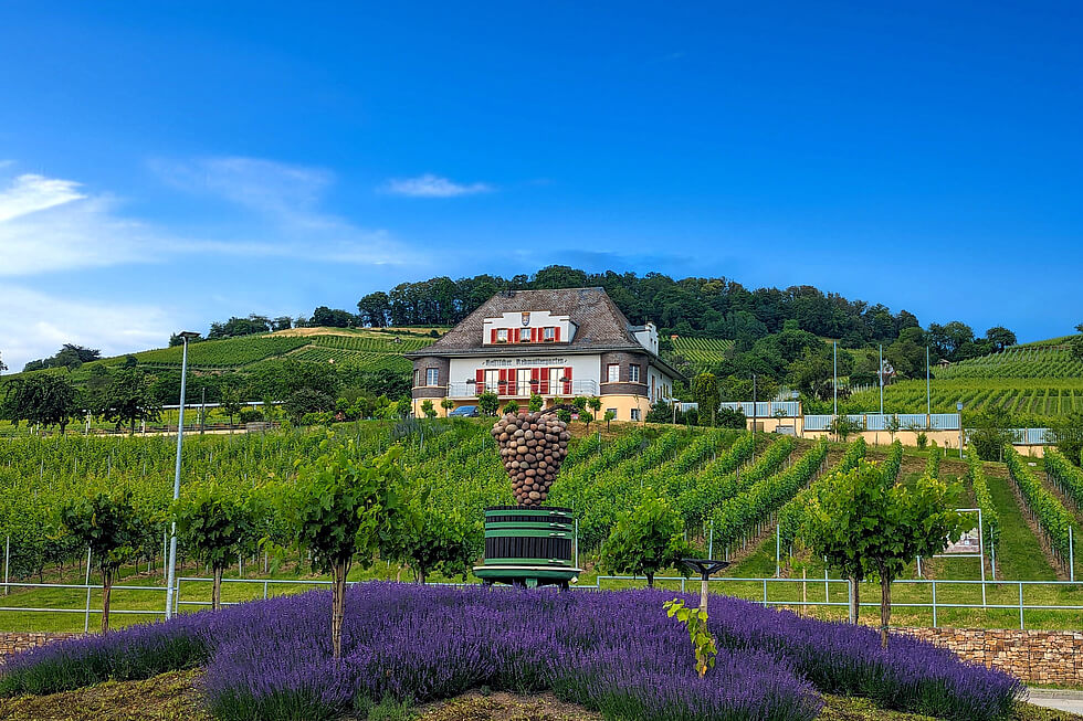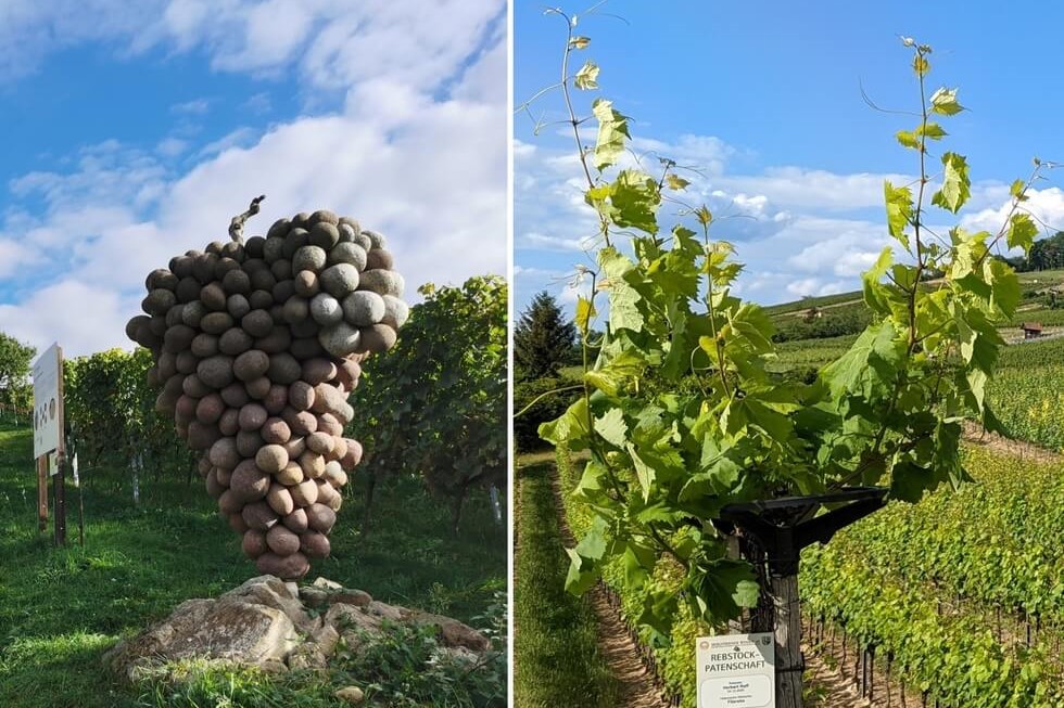 Der Erlebnispfad Wein und Stein ist ein Rundweg, der sich knapp 7 Kilometer durch die Weinberge schlängelt. Man kann auf vorwiegend asphaltierten Wegen gemütlich durch die Natur spazieren, sich treiben lassen, ab und zu stehenbleiben, um sich rund ums Thema Weinanbau zu informieren, ein Kunstwerk bestaunen oder einfach nur den Blick über die sanften Hügel oder die Rheinebene schweifen lassen.