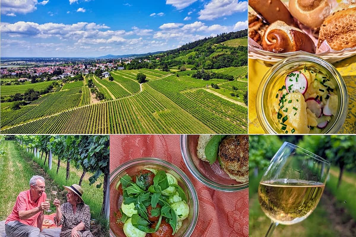 In der Weinscheuer werden wir schon erwartet. Wir erhalten einen gepackten Picknickkorb und eine Wegbeschreibung, mit der wir uns aufmachen in die Weinberge. Der Korb ist gut gefüllt mit Köstlichkeiten, Wasser und Wein. Ein Viertelstündchen wandern wir vorbei an Reben, den Hang hinauf. Dann haben wir es geschafft. Bei strahlendem Sonnenschein und angenehmen Temperaturen genießen wir den Nachmittag und das Picknick im Grünen. Ein schönes Erlebnis und ein gelungenes Geschenk!