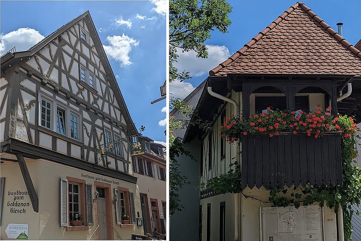 Der historische Ortskern ist klein. Für einen Stadtrundgang orientiert man sich am besten am „Schriesheimer Wappen“, das zu den 19 Sehenswürdigkeiten Schriesheims führt, die einiges über die Geschichte der Stadt erzählen. Beispielsweise das Gasthaus "Zum goldenen Hirsch" (1662) - eines der ältesten Gasthäuser der Bergstrasse - oder das idyllische "Bachschlössel" am Kanzelbach, der im Odenwald entspringt, durch Schriesheim fließt und bei Neckarhausen in den Neckar mündet.