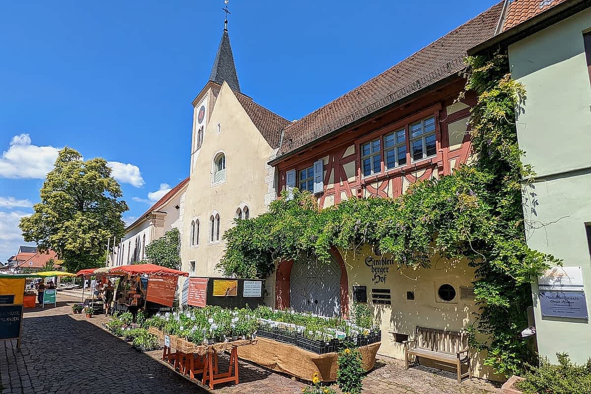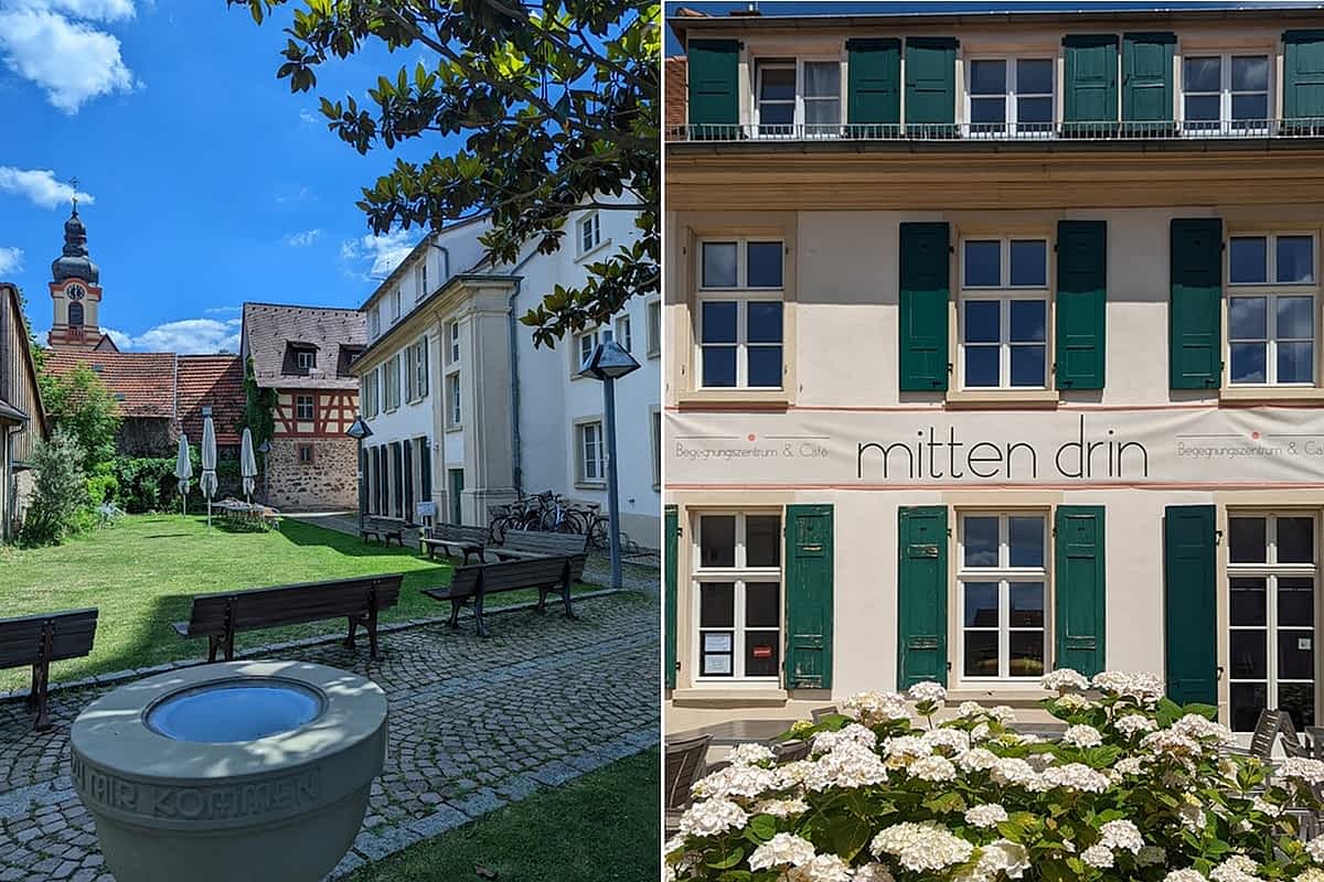 Unsere Entdeckungsreise in die Vergangenheit führt als erstes in den romantischen Innenhof der evangelischen Kirche. Hier ist es herrlich. Gefühlt befinden wir uns in einer anderen Welt. Eine ruhige, beschauliche Welt zum Abschalten und Entspannen. Wir verweilen ein wenig auf einer der Bänke und lassen die Seele baumeln. Noch so ein schöner Ort ist das Begengunszentrum „mitten drin“, das sich im historischen „Alten Gemeindehaus“ direkt neben der Kirche befindet. .Ein Café und Treffpunkt für alle Menschen mitten im Ortsgeschehen. Was für eine wunderbare Idee.